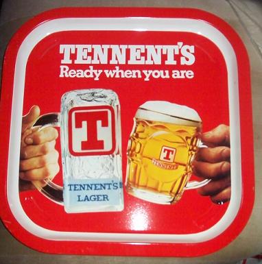 This is a brewery advertising tray for "Tennent's Lager". It measures 13 inches by 13 inches and is in excellent condition.
